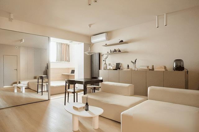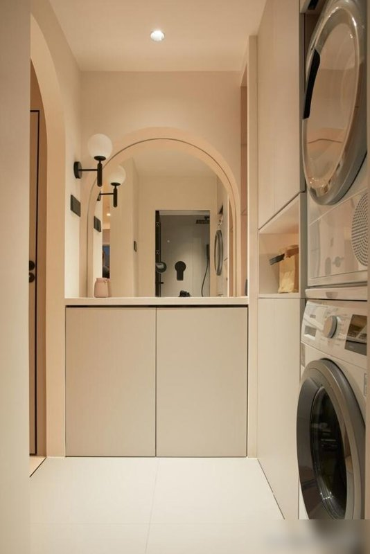镜面折射拓展视野,拱形门洞柔化分区,奶油色系统一视觉,连开关插座都藏在顺手位置。